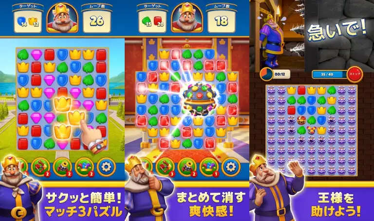 「ロイヤルマッチ」は、同じ種類のタイルを3つ以上つなげて消す定番パズルゲームです。プレイヤーはゲーム内のキャラクター王様ロバートと一緒に、荒れた城や庭を修復・装飾していきます。クリアするとストーリーが進み、新しいエリアやステージがアンロックされます。